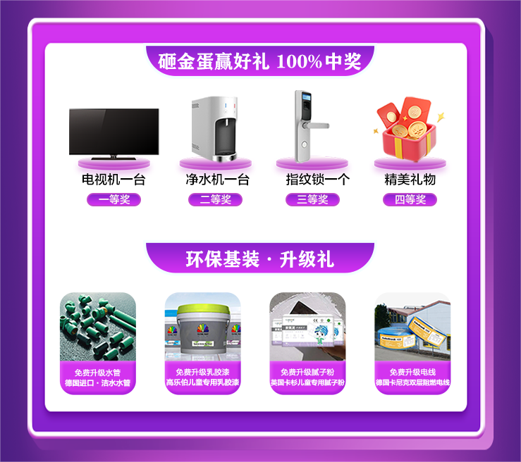 限時搶購:活動期間,每天還將推出一定數量的廚衛家電定裝修搶家電,數量有限先到先得。互動抽獎:為了讓您更加深入地參與到我們的活動中來,我們還特別設置了砸金蛋環節。100%中獎。
