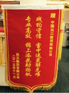 為保障企業正常經營,中國信保依據保險合同就企業的損失進行了足額的賠償,賠款金額高達1000多萬美元。從企業通知風險發生到獲得賠款僅用了不到2個月的時間。西王國際貿易有限公司總經理馬本強說:“這個案子我們有兩個沒想到:一是沒想到市場風險這么大,我們做國際貿易這么多年,真的沒想到這么大金額的即期信用證,開證行能夠違反國際慣例擅自違約;二是沒想到這么大的案件中國信保能夠在這么快的時間內支付賠款。說句實在話,這個案子之所以能有今天這么圓滿的結果,是中國信保的專業給我們企業創造的價值。”西王集團副總經理王紅雨更是感概萬分:“此次企業面臨巨額損失,中國信保雪中送炭,不愧是為外貿企業排憂解難的好幫手。”