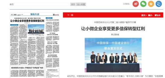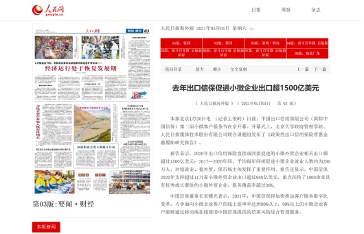 近日,中國信保舉行第二屆小微客戶服務節開幕式。《人民日報(海外版)》、新華社、中央電視臺、《光明日報》、《經濟日報》、《國際商報》、《金融時報》、《中國銀行保險報》、《中國財經報》、新華網等800多家新聞媒體進行了報道和轉載,多角度展示了中國信保加快數字化轉型,有針對性地推出多項普惠金融政策措施,做深做實小微企業服務的舉措和成績。4月28日,中央電視臺財經頻道《第一時間》以《金融政策加碼,支持外貿型小微企業》為題,報道了中國信保加快推動客戶服務數字化變革,構建小微數字化服務體系的成績。5月1日,在全國人民歡度五一國際勞動節之日,《人民日報(海外版)》要聞版以《去年出口信保促進小微企業出口超1500億美元》為題,以詳實的數據肯定了公司對“穩就業”、“穩外貿”、“保市場主體”發揮的重要作用。