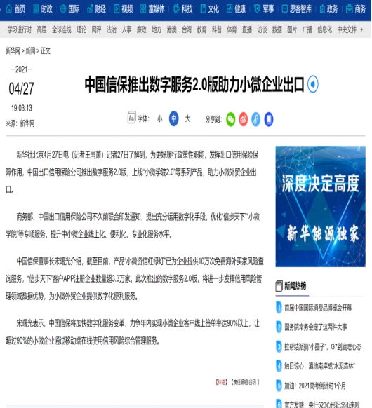 新華社:中國信保推出數字服務2.0版助力小微企業出口