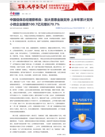 中國網:中國信保總經理蔡希良:加大普惠金融支持 上半年累計支持小微企業融資100.7億元增長70.7%