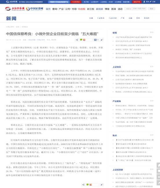 《上海證券報》:中國信保蔡希良:小微外貿企業目前至少面臨“五大難題”