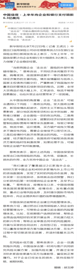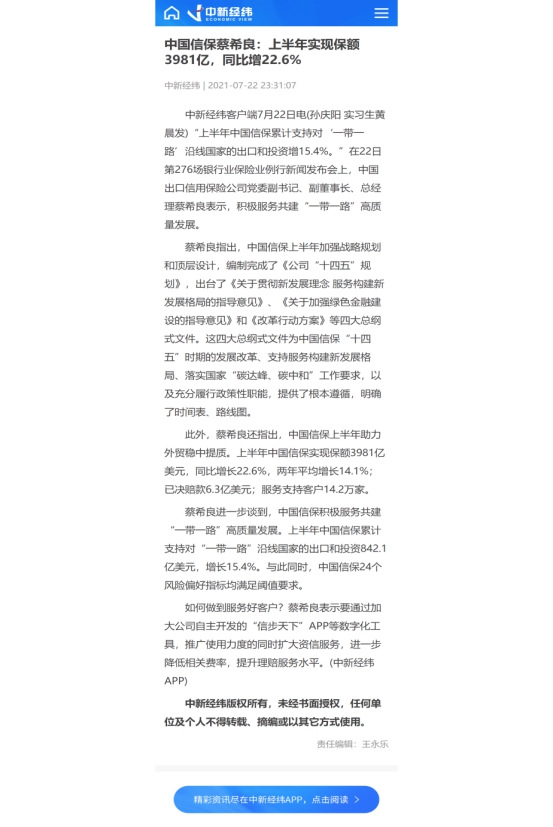 中新經緯:中國信保蔡希良:上半年實現保額3981億,同比增22.6%
