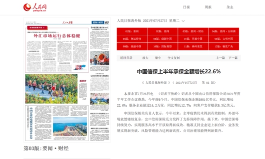 《人民日?qǐng)?bào)》海外版:中國(guó)信保上半年承保金額增長(zhǎng)22.6%
