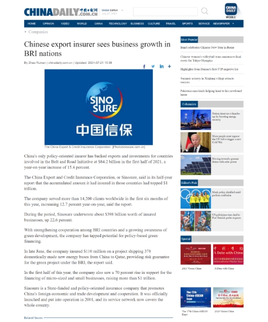 《CHINA DAILY》:Chinese export insurer sees business growth in BRI nations