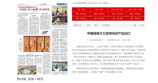 《人民日報》(海外版):中國信保大力支持光伏產業出口