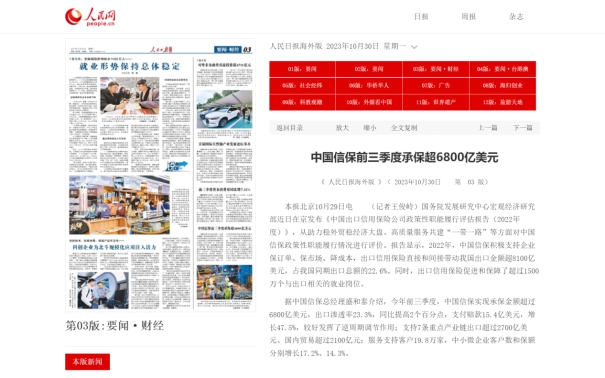 《人民日報海外版》:中國信保前三季度承保超6800億美元